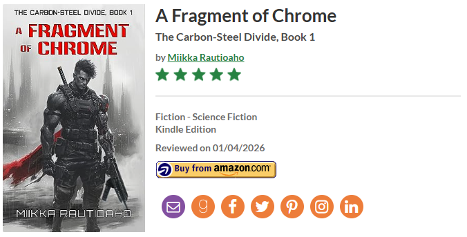 6.1.2026 A Fragment of Chrome receives its first mini-review by Readers' Favorite. Find it here. Individual ratings were: Appearance 4, Plot 5, Development 5, Formatting 4, Marketability 5, Overall Opinion 5.